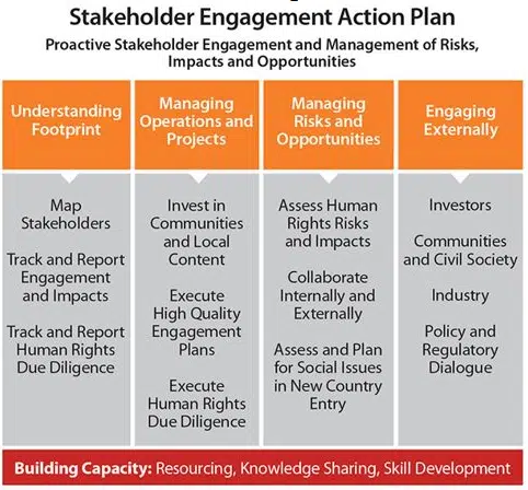 تعهدات و پیشرفت برنامه عملیاتی از طریق یک فرایند اداره یکپارچه مدیریت میشود که شامل درگیری رهبری اجرایی و هیئت مدیره میشود. مسائل مربوط به مشارکت با مشارکتکنندگان، گروه کاری تحت هدایت یک عضو تیم توسعه پایدار و مسئول مدیریت برنامه عمل است. اعضای این گروه شامل روابط اجتماعی، حقوق بشر و متخصصان موضوع بومی، مشاوران، رهبران تیم و مدیران نمایندگی اکتشاف و تولیدات جهانی هستند. هر یک از کسب و کارهای مختلف مسئول کمک و اجرای برنامه اقدام به مشارکت در سطح ذینفعان است. شبکه داخلی بین المللی ابزار اصلی به اشتراکگذاری دانش برای اعضای گروههای مسائل مربوط به انتقال دانش، به اشتراکگذاری نوآوری و بهترین شیوهها و ایجاد همکاری است.